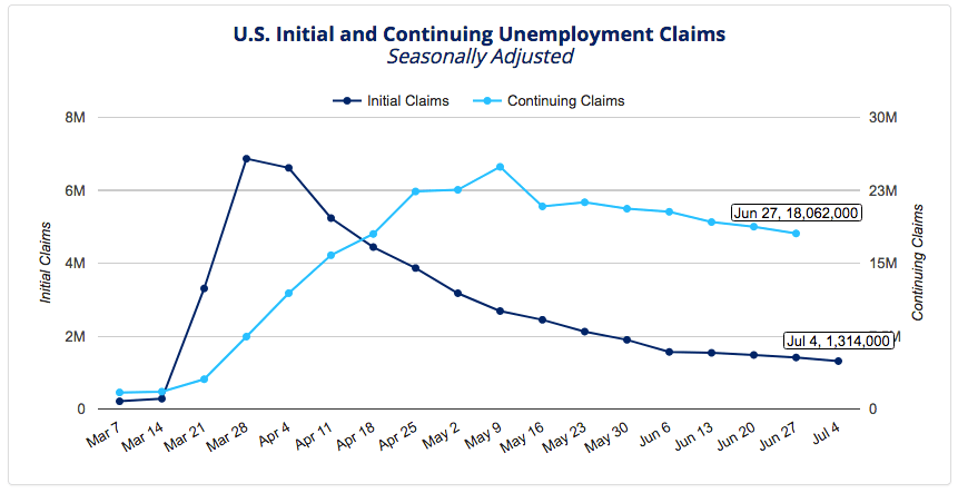 The same thing goes for continuing claims. The chart depicts that these claims have been pretty flat since mid-May. There was a positive jobs report in June nationally, but this is probably going to tick up again as we are seeing with Texas, California, Arizona, Florida starting to boom with Coronavirus recently. As more and more vulnerable individuals become infected, we’ll see their economies re-closing and this will mean that we will see numbers creep back up again (slowly or rapidly).