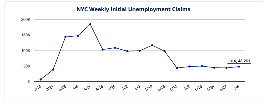 Scott M. Stringer’s Chart 3 above depicts New York City unemployment claims. We have currently – 48,261 initial/first time unemployment claims as of July 4th, 2020. Please note that this is not continuing claims. You can still see that the trend is still flat; it’s not trending down. It is still the number that we had in the end of March – but slightly higher.