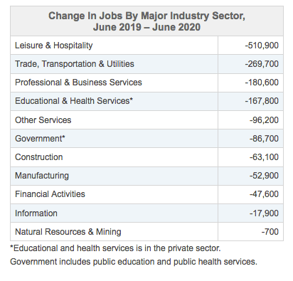 According to NYS Department of Labor, “Since June 2019, the number of nonfarm jobs (private plus public sectors) in New York State decreased by 1,494,100, or 15.1 percent, and the number of private sector jobs decreased by 1,407,400, or 16.8 percent. Additional industry detail is presented in the table below.”