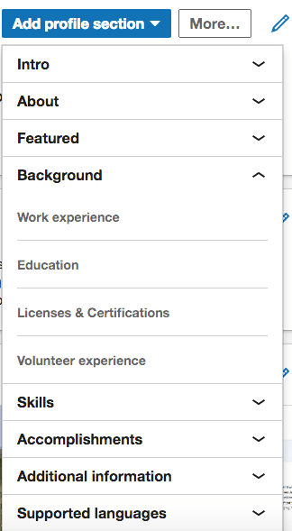 When you are on the right side of your page, you want to point your cursor to “Add Profile Section” and all of the sections/categories appear where you can begin editing your profile and include your information.