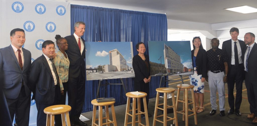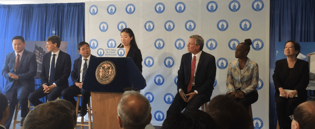 Stephanie Cheng speaking at City Hall In Your Borough To the left of Stephanie – Peter Koo (NYC Council Member of District 20) To the right of Stephanie – NYC Mayor Bill de Blasio