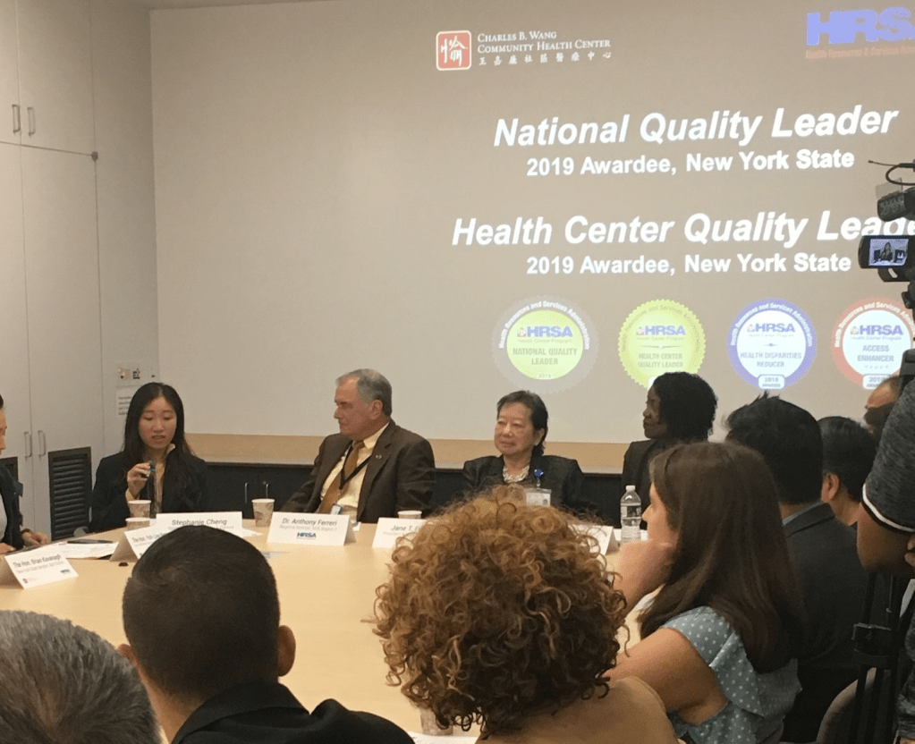 Left – Stephanie Cheng (Board Member of Charles B. Wang Community Health Center) / At a Press Conference